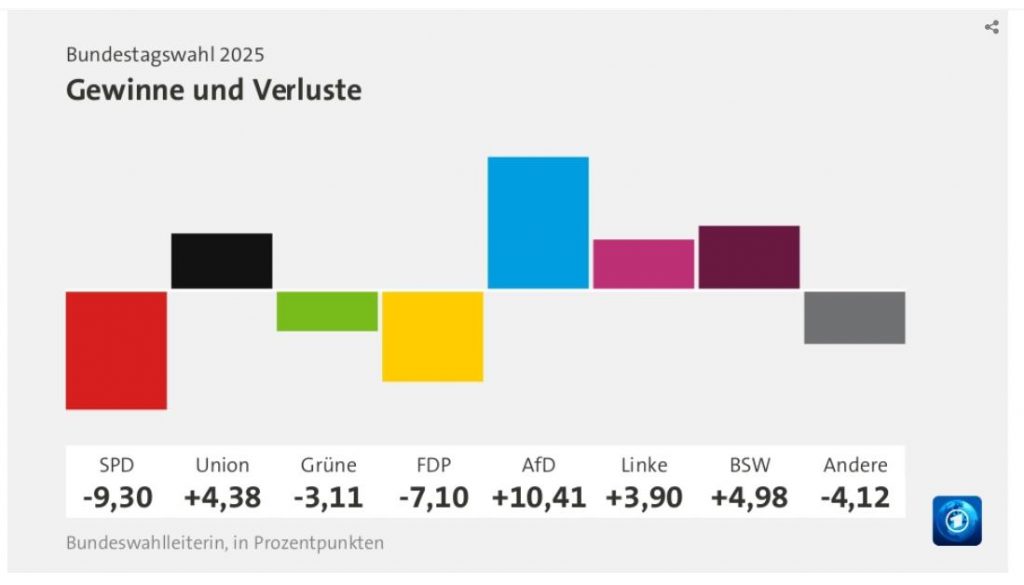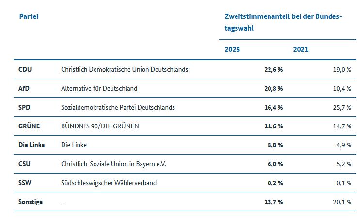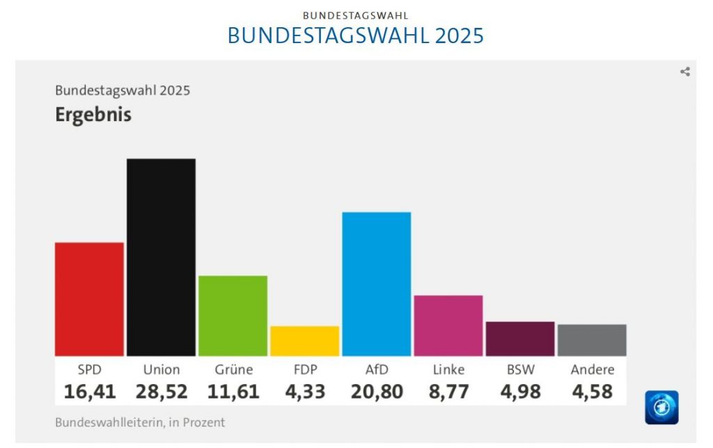 Beginnen wir mit dem Ergebnis der Bundestagswahl 2025 (Quelle: tagesschau)