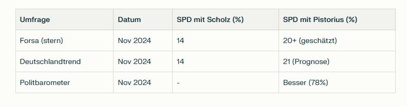Die Prognosen für die Zweitstimmen der SPD lagen mit einem Kanzlerkandidat Boris Pistorius zwischen 20% und 21% (Quelle: perplexity.de basierend auf der Auswertung von 20 Quellen).